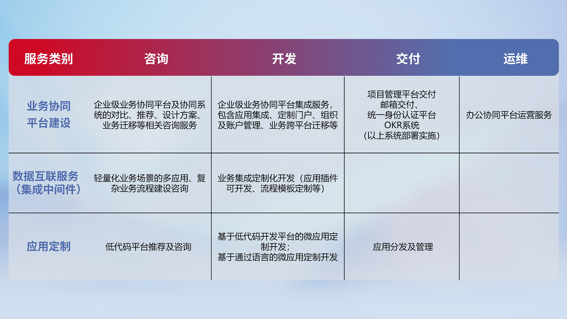 针对钉钉、、企微、、、IDaas等平台级产品提供产品的规划、、、方案、、、交付、、定制化开发等服务,,,,实现如统一协同办公、、智能客户服务、、、、混合会议管理、、、智能数据查询、、、等业务场景,,,,实现数字化转型。。。。